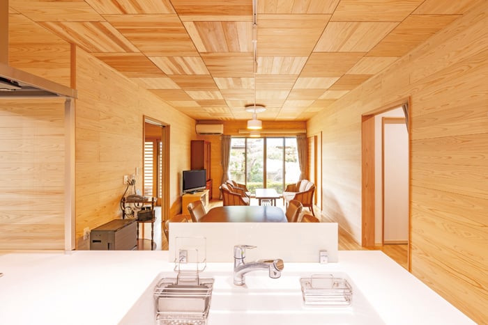 壁、天井ともに杉のムク板張りで構成したナチュラルな空間。「昇降式の物干しを提案してもらいました。雨の日はもちろん、外干しした洗濯物を一旦掛ける場所としても便利。とても重宝しています」と奥様。